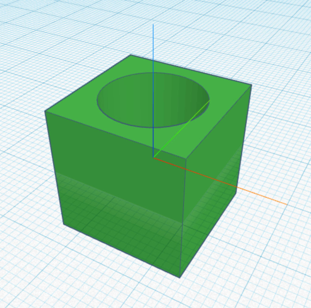 Let’s start playing with codeblocks. We are going to start by coding the same thing that we just created manually in Tinkercad. Just as we did before, we will place a cube, rotate around and check it out, and then add a hole-colored cylinder, group them, and make them green.