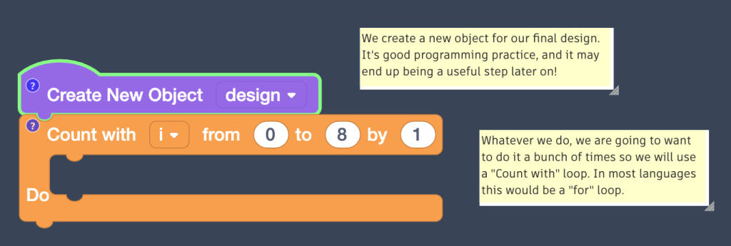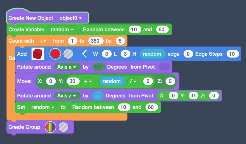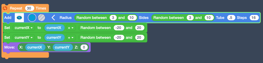 Next, we will create a Repeat loop to make and move 30 random shapes. You can increase or decrease this (or any other number) when you have the program running, but start small to begin with so it doesn’t take too long to run the program while testing. In the loop we will: