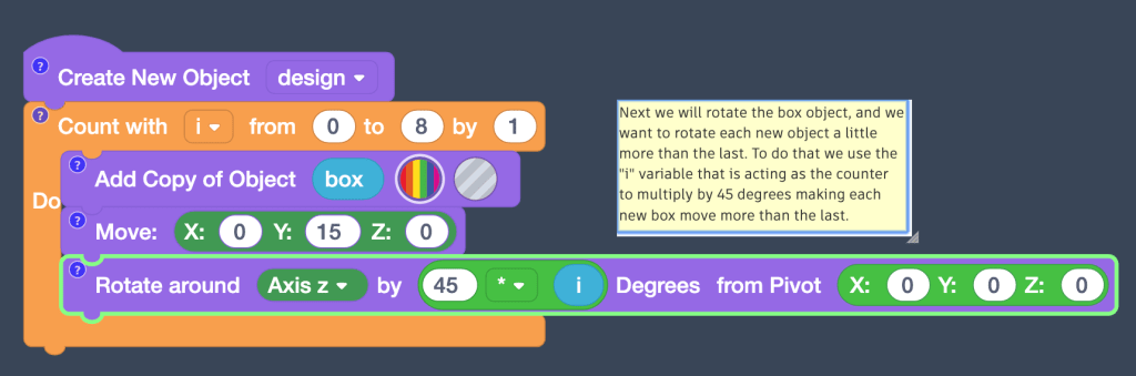 We are going to create a loop that will create multiple copies of the box, placing them in different locations and at different angles each time.